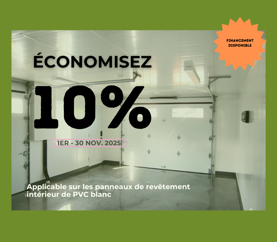 Du 1er au 30 novembre inclusivement. Offre applicable sur les panneaux de revêtement intérieur de PVC blanc seulement.